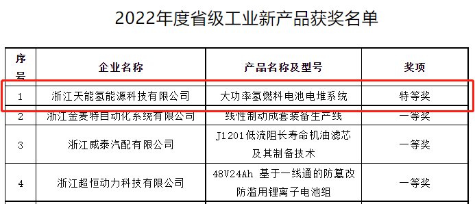 近日,浙江省长兴县经济和信息化局公示了2022年度省级工业新产品获奖名单,由浙江jiuyou.com氢能源科技有限公司研发生产的大功率氢燃料电池电堆系统获得全县唯一省级特等奖。